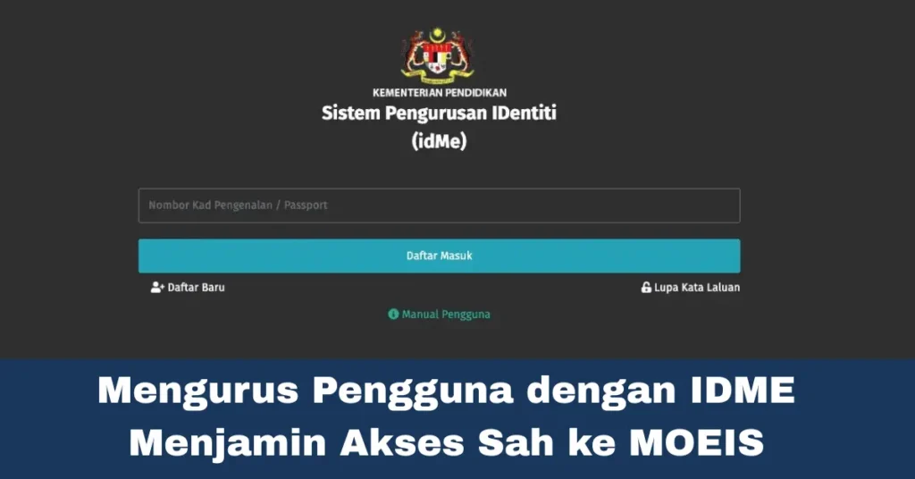 Sistem IDME (Identity Management for Education) berfungsi sebagai pintu masuk utama bagi pengguna untuk mengakses MOEIS (Ministry of Education Integrated System) dengan cara yang selamat dan terkawal. Melalui IDME